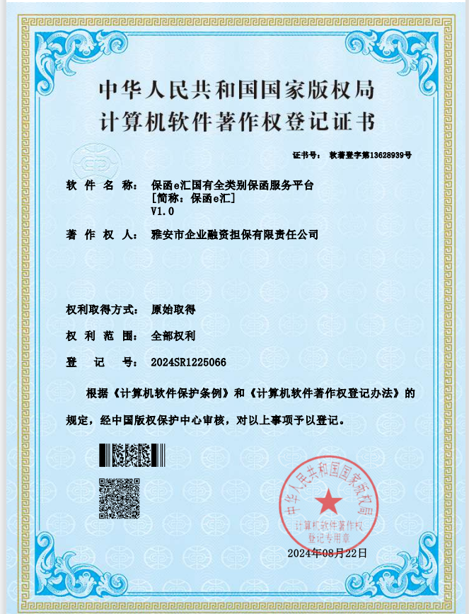 喜訊!雅安市擔(dān)保公司取得“保函e匯”軟件著作權(quán)